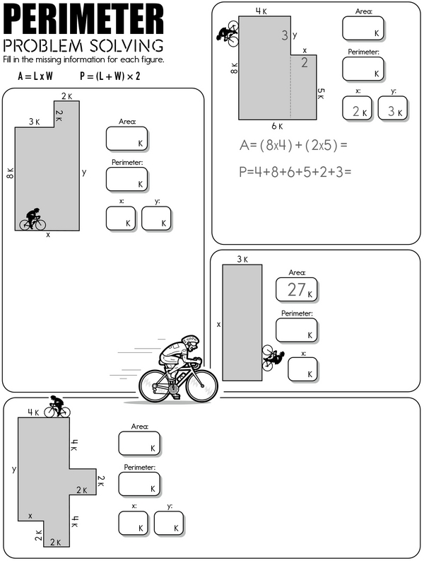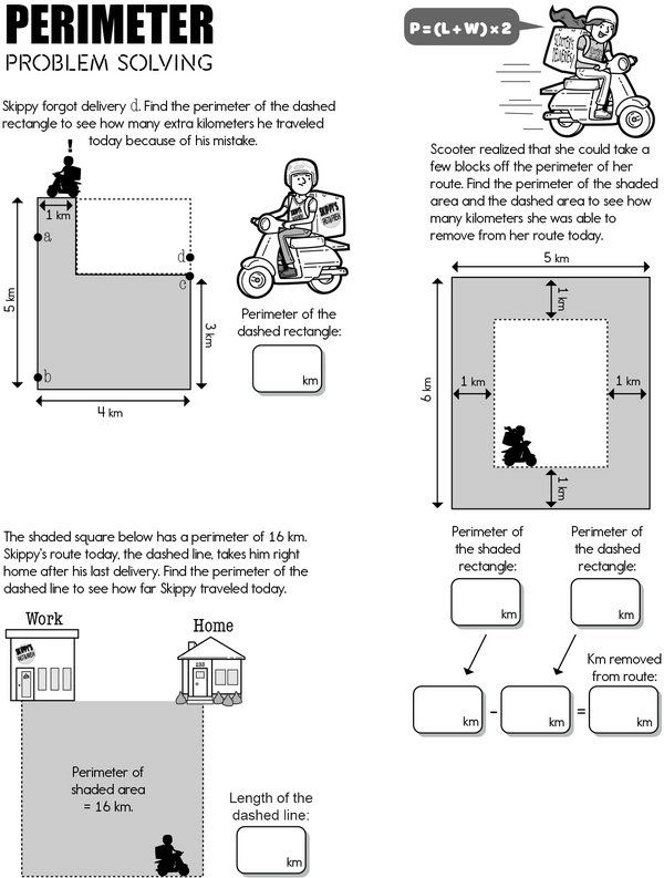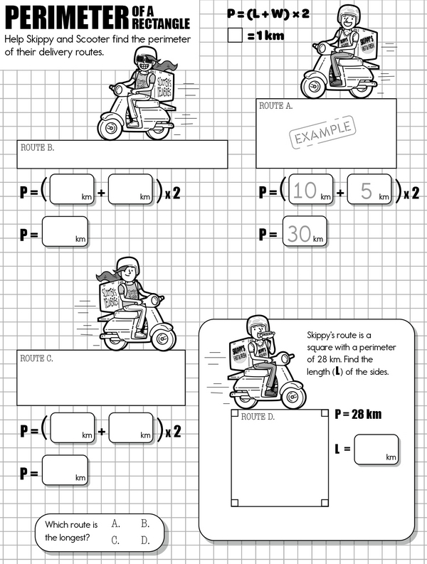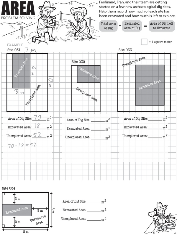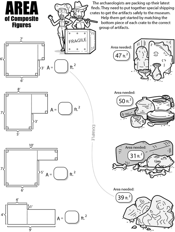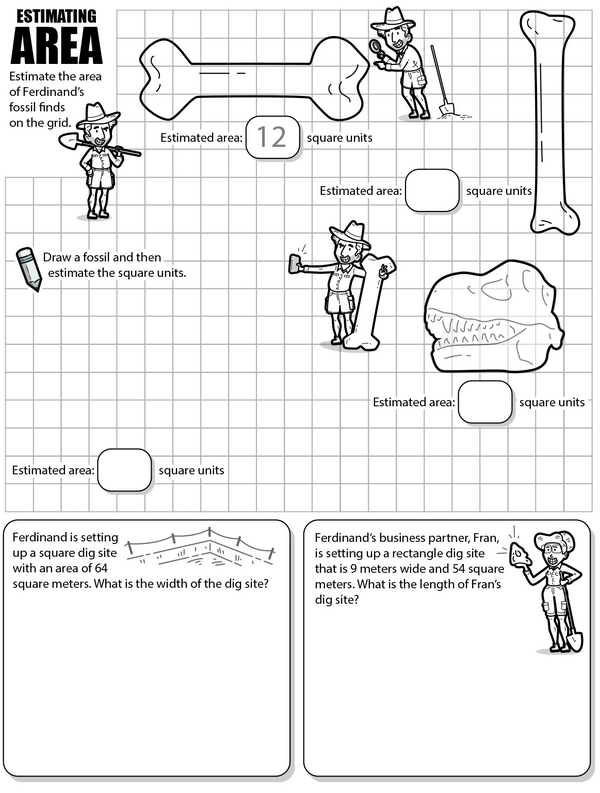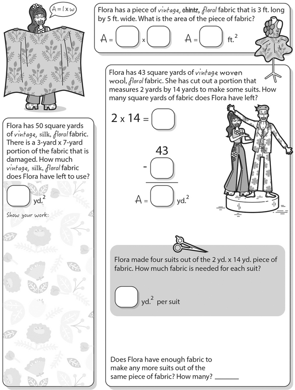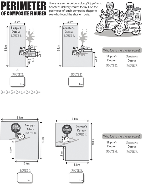 Let's get to work! First, help Flora cut fabrics for her fashion show. Study the step-by-step example, then calculate the areas of the fabrics she needs. Next, join Ferdinand and Fran for some excavation fun! Estimate the areas, figure out the width and length of two new sites, and solve the areas of composite figures. Then, tag along with Skippy and Scooter as they deliver packages. Check out their routes and calculate the perimeters. Finally, can you solve both the areas and perimeters of these figures? Thanks a bunch!