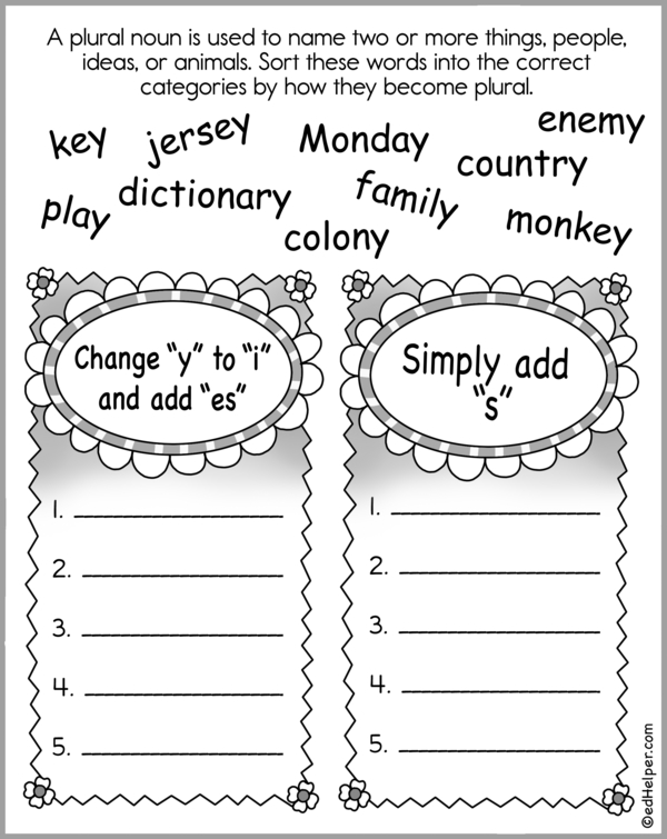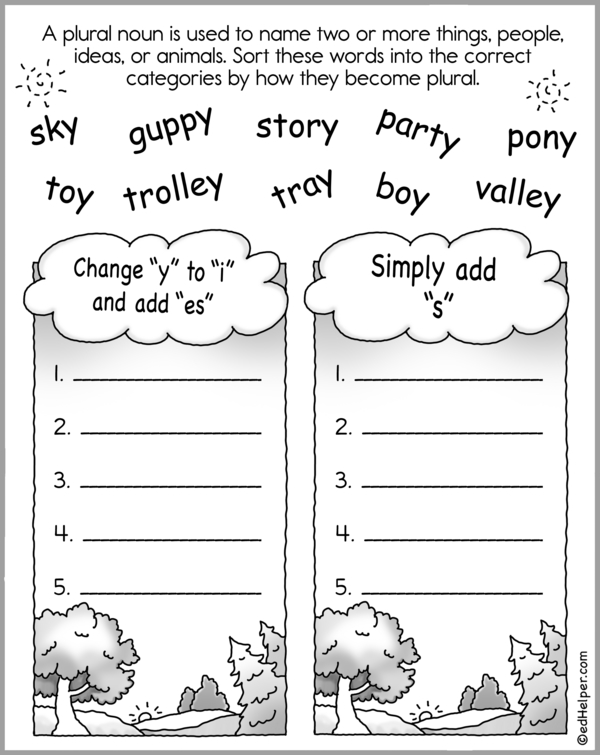 This workbook features three more pages, each with words that end in "y." Kids need to figure out how to make the plural of the singular noun and write the plural form in the boxes.