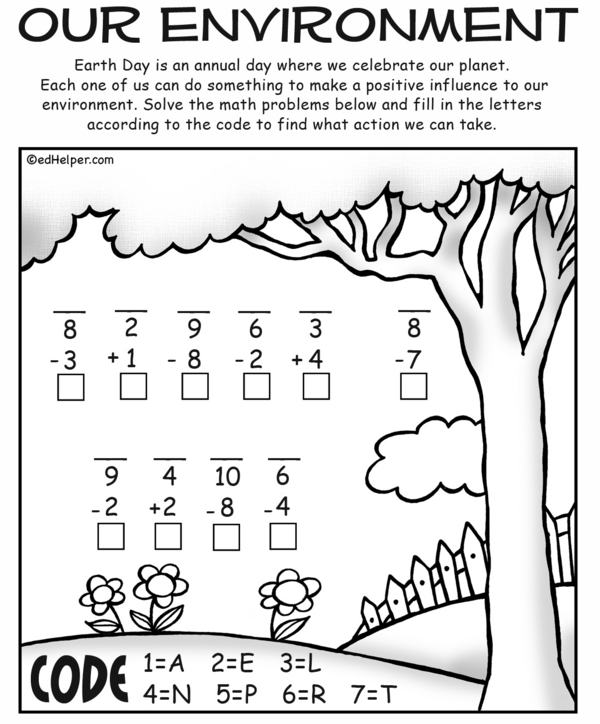 It's fun to be a math detective! On page 1, read the clues and solve four puzzles. Then, use subtraction to break the code and discover what you can do to help our planet.