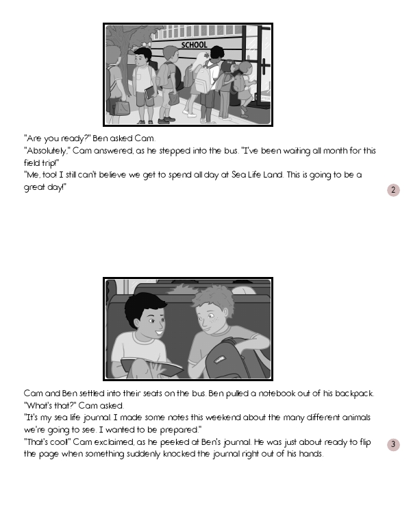 The story contains 1992 words. The story is suitable for children in the elementary school range of 3rd to 5th grade. The simple sentence structures and familiarity of the school trip setting make it easy for this age group to comprehend, while the information on sea animals introduces some educational elements. Vocabulary that may be challenging for early readers includes "absolutely," "settled," "booming," "surprised," "striped," "sewn," "clownfish," "journal," "mammals," "reptiles," "species," "dolphin," "bottlenose," "exclaimed," "tremendous," "orca," "exhibit," "manta rays," "gills," "cousins," "tropical," "aquarium," "teased," "confirmed," "rescue," "panicking," and "drowned rat."