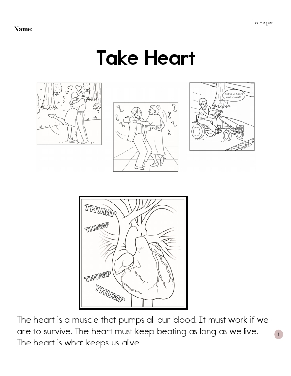 After reading the story "Take Heart," first-grade children will learn about the heart as a vital organ and symbol in various idiomatic expressions. They will understand the heart's essential role in pumping blood to keep us alive. Additionally, children will explore the metaphorical meanings of the heart in common phrases like "having no heart," "eating your heart out," and "brokenhearted."