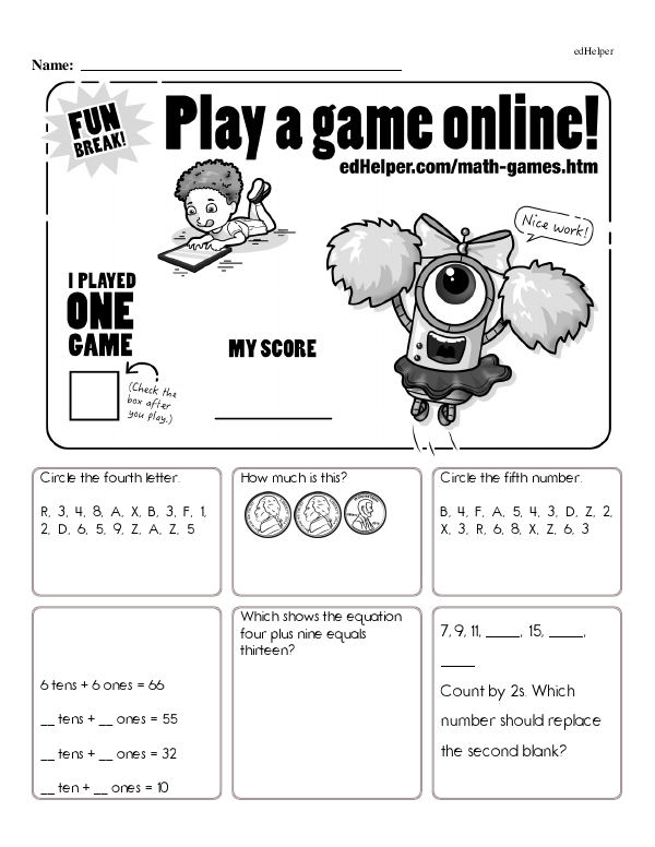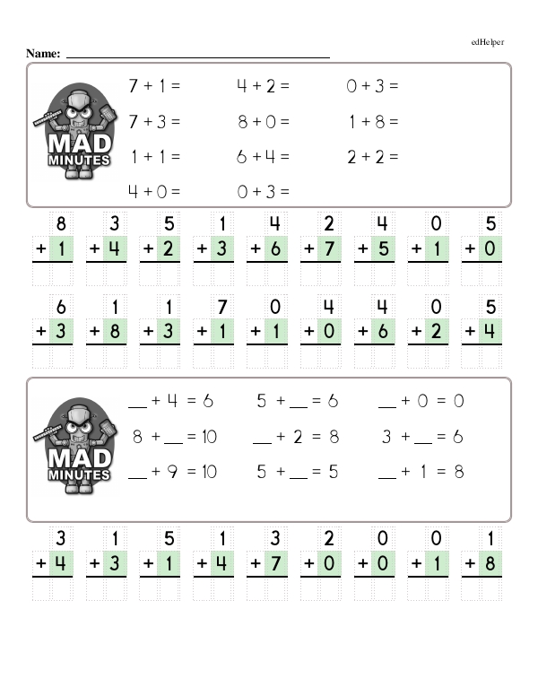 This math chapter workbook on "Addition Facts to 10" focuses on helping students understand basic addition concepts by using numbers up to 10. This involves introducing the idea of putting together two groups of objects to find how many in total, using visual aids like counting blocks, number lines, or pictures to illustrate these concepts. This workbook covers facts such as 1+1=2, 2+3=5, up through 9+1=10, emphasizing patterns, such as doubles (e.g., 4+4) and combinations that make 10 (e.g., 7+3).