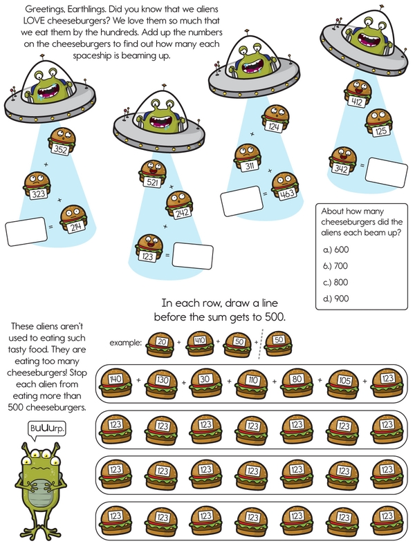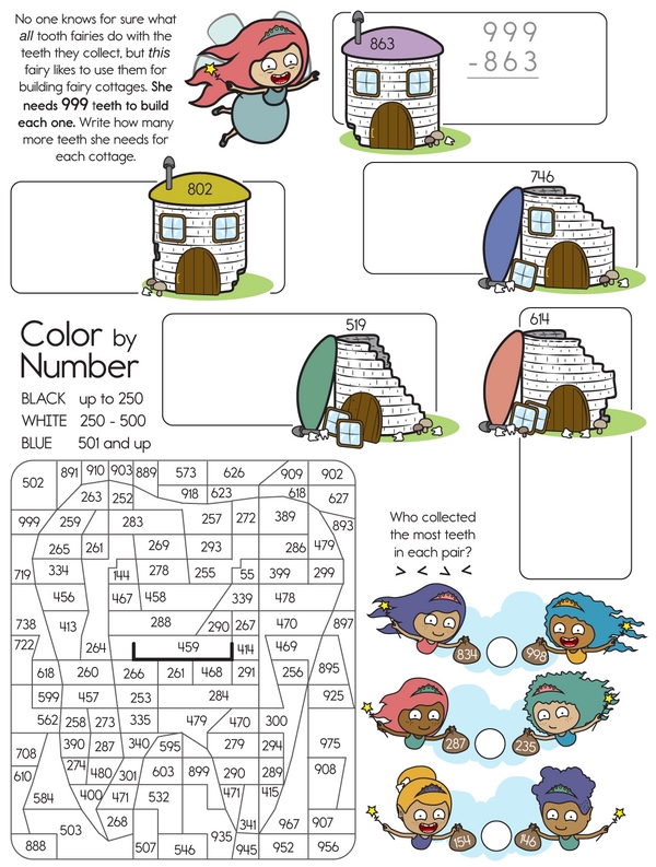 Let's get ready for some addition practice! The first sheet presents simple 2-digit addition exercises to help kids ease into more advanced problems. Page 2 introduces 3-digit addition with a fun twist-kids must add up as much as they can without exceeding 500. This activity helps them grasp number values as well as the concepts of greater than and less than. For the grand finale, the last page combines a color-by-number activity with some subtraction practice for added enjoyment.