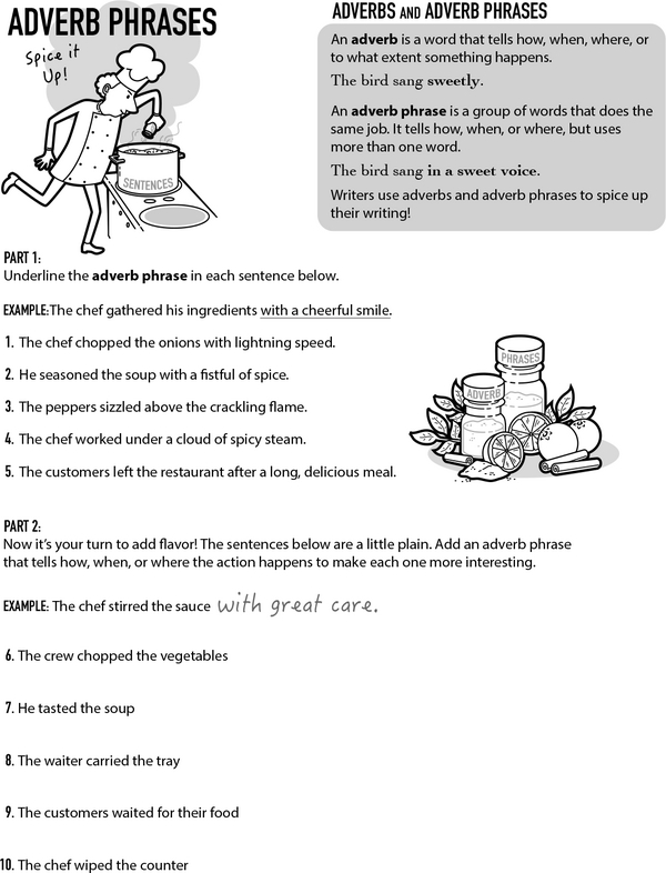 Welcome to Kitchen Adverbs! We love flavoring sentences with adverbs and adverb phrases. Since you're already an adverb superstar, today we'll focus on adverb phrases! Follow the examples, then complete the activity.