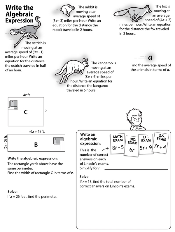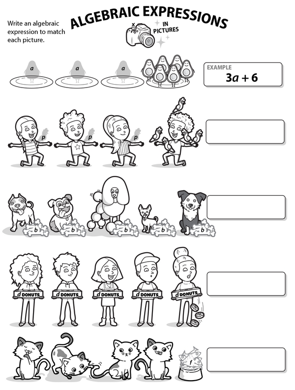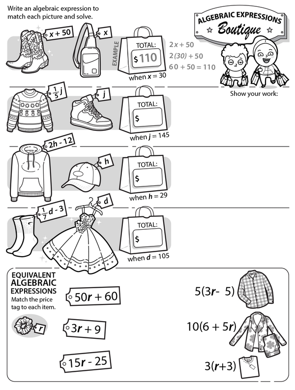 Be expressive! Look at the four pictures on page 1. Can you write an algebraic expression to match each one? At the boutique shop on page 2, write an algebraic expression for each picture and calculate the total of each shopping bag. Don't forget to match the price tag with each item. Lastly, on page 3, read the clues and write your answers as algebraic expressions.