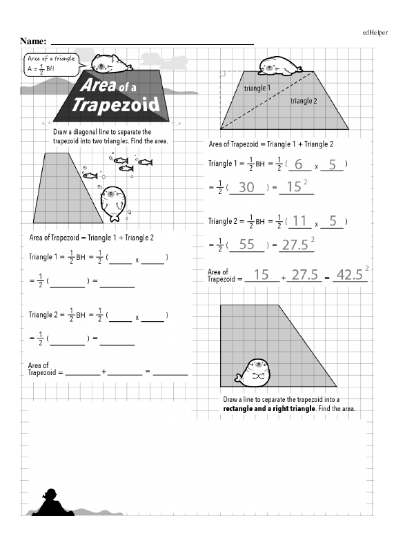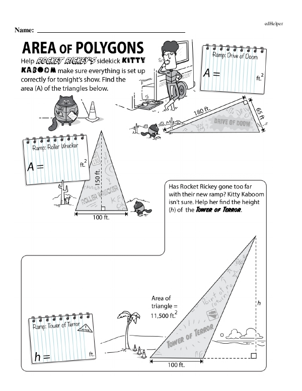 This math chapter workbook on "Area of Polygons" focuses on finding the area of various polygons. In some problems, coordinates are also given. For example on one page students need to solve for the area of a triangle given the points (-4, 4), (-4, -2), and (6, 0). They can start by plotting these points on a coordinate graph. Once plotted, they will notice that the points (-4, 4) and (-4, -2) form a vertical line, making it the triangle's height. The length of the height is 6. The point (6, 0) can be connected horizontally to form the base of this triangle. To find this base's length, count horizontally from x = -4 to x = 6, which gives you a base of 10 units. Then, students must remember the area formula for triangles to find the area. Other pages in this workbook contain various problems that involve calculating the area of different polygons.