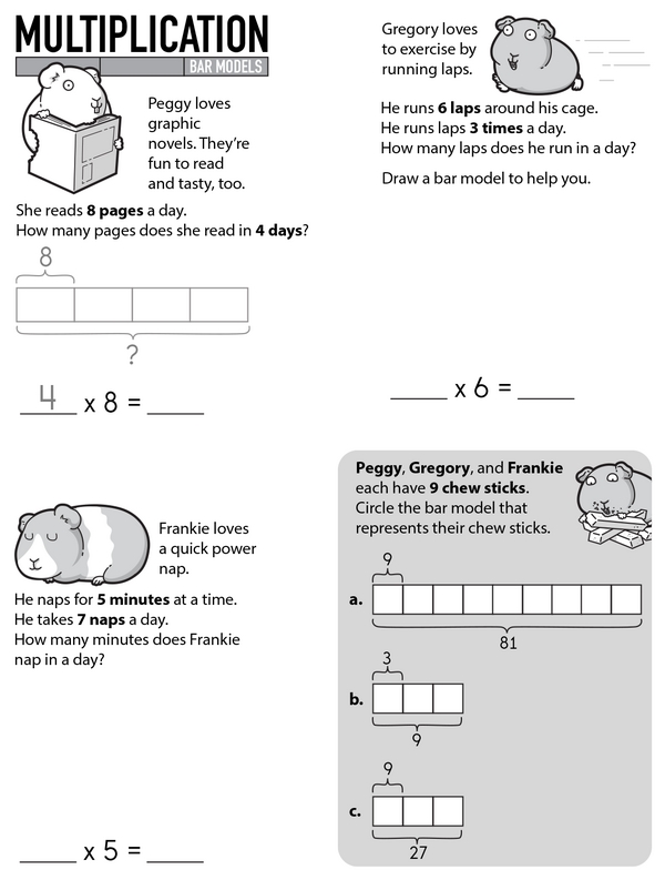 Bar models are a fun way to solve math problems. The whole bar represents the total amount. The number of segments shows how many groups there are, and each segment represents the amount in each group. For example, Hamster Peggy gets 7 scoops of oats, and there are 5 oats in each scoop. To show this problem with a bar model, draw a long rectangle and divide it into 7 segments for the 7 scoops. Above or inside each segment, write 5, because that is the size of each group. You can either skip-count by 5 seven times or multiply 7 x 5 to get 35. You can also use bar models to solve division problems. Ready to give it a try? Study the examples, then complete the activities.