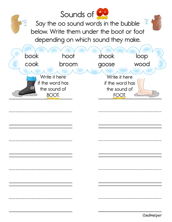 Words with 'oo' can be tricky! Some make the long u sound, and others make the short u sound. Say each word in the bubble. If it has the long u sound, write it under Team Boot. If it has the short u sound, write it under Team Foot.