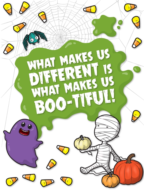 Poster #3 features many fun things about Halloween: a friendly ghost, a mummy giving out pumpkins, a curious spider, and lots of candy corn.