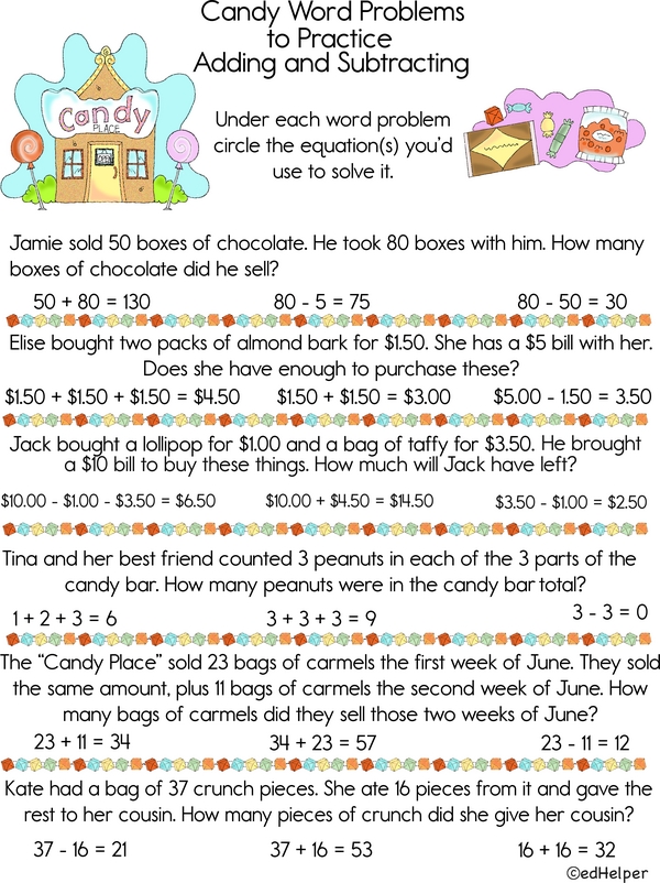 Ready for some sweet math challenges? Each word problem at Candy Place comes with three equations. One or two of them hold the key to the answer. Use addition and subtraction to find them all!