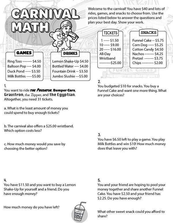 Woohoo, carnival time! You've got $40 in your pocket, and you want to stretch it for maximum fun. Check out the price lists for games, drinks, tickets, and snacks. Read each problem carefully, then use addition and subtraction to solve it. Don't forget to show your work!