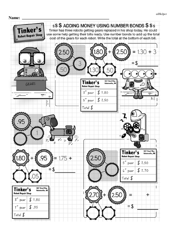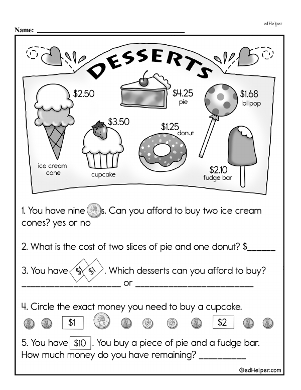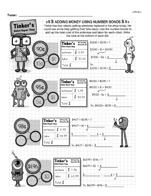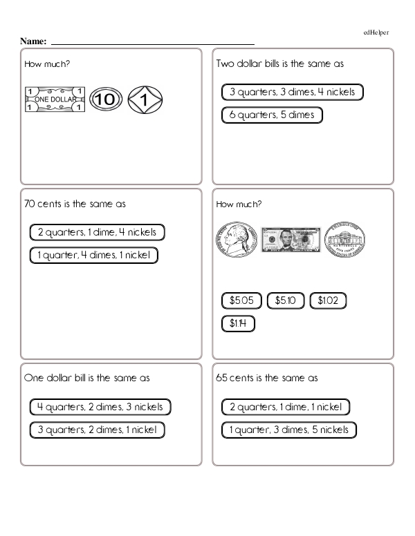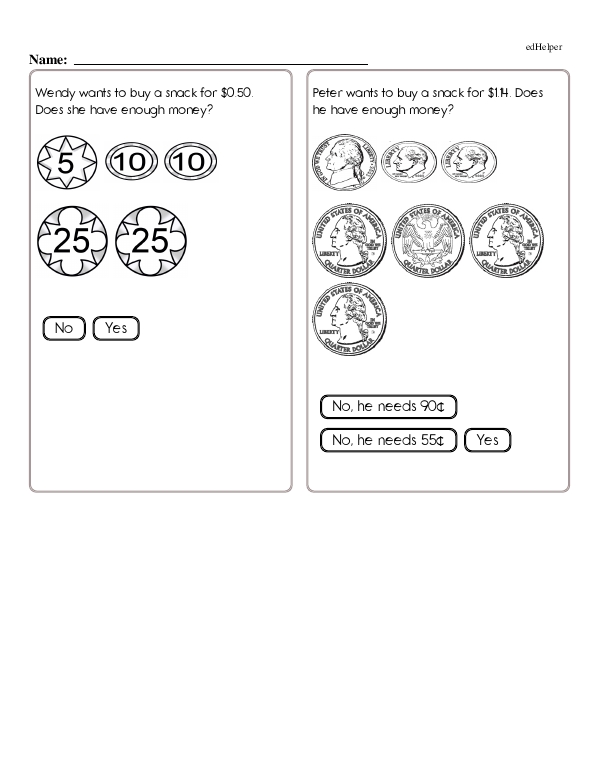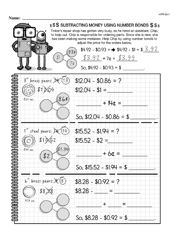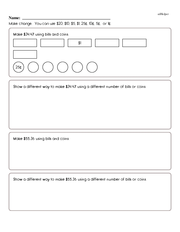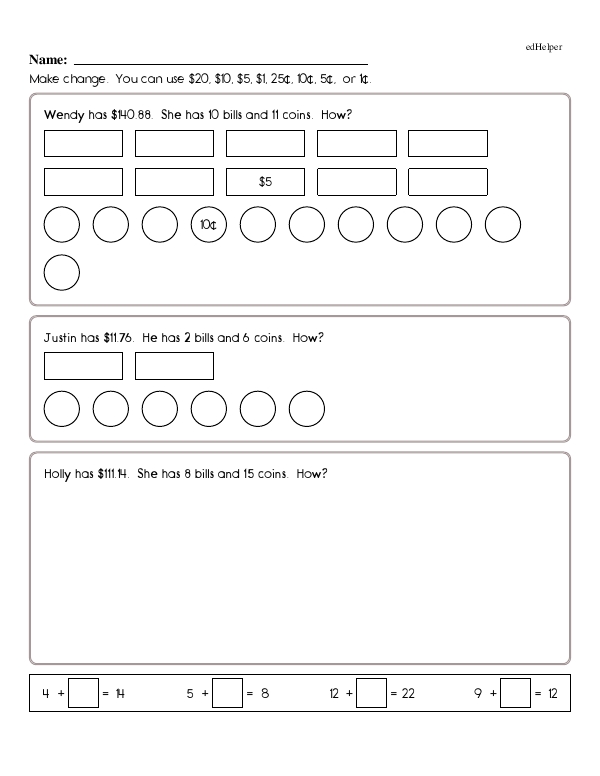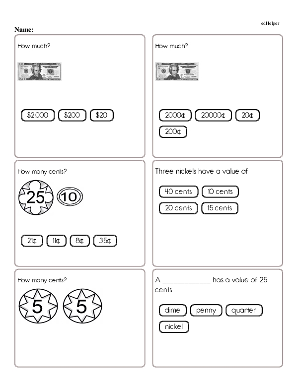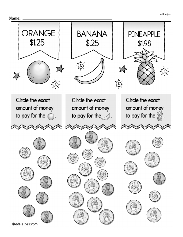 The workbook "Cash-Smart Kids: Fundamental Money Skills Workbook" continues to practice to help students understand the basic concepts of currency, including identifying and differentiating between coins and bills. Students practice understanding the values of common coins like pennies, nickels, dimes, and quarters, as well as typical bills such as $1, $5, $10, and $20. Problems include counting money, making change, and understanding how to add and subtract different monetary values. Using real-life scenarios, like buying items and calculating total costs or change, helps solidify these concepts.