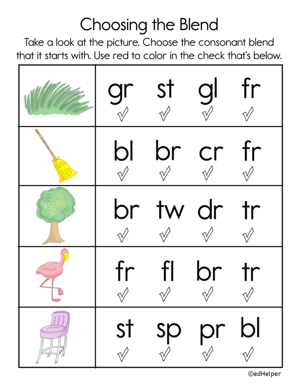 Look at these five picture words. They all begin with a consonant blend. That means you can hear each letter in the blend. For example, the 'bl' in blue is a consonant blend. Now, for each picture word, find the right consonant blend and color the check below red.