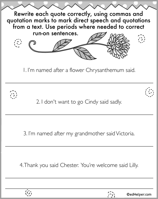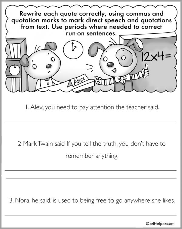 Students must revise sentences on these worksheets by adding missing quotation marks and commas. They should ensure that direct speech and quotations from a text are correctly punctuated and that any run-on sentences are corrected with periods.