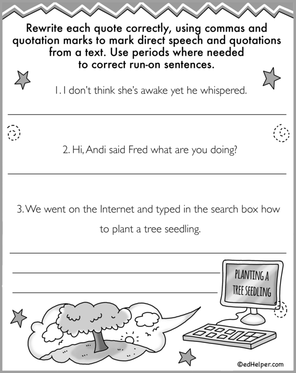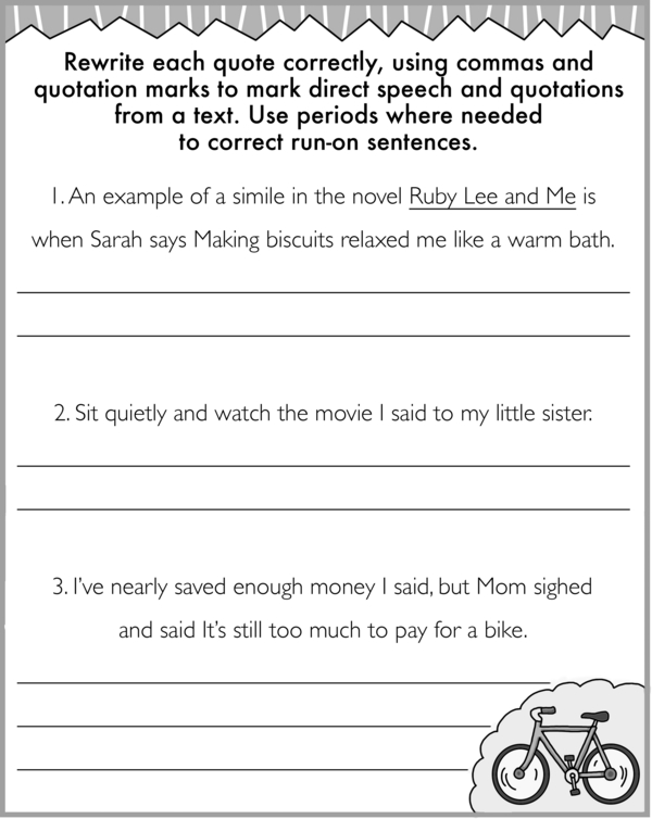 This is the 3rd and final workbook to practice the correct punctuation marks in direct speech. Marking direct speech with quotations is like showing exactly what someone is saying. For example, if your friend Sally said, "I love ice cream," you would write it exactly like that with her words in quotation marks. You also start the sentence with a capital letter and use a comma before the quote if it's part of a sentence. So, you might write: Sally said, "I love ice cream." This helps readers know what Sally said word-for-word.
