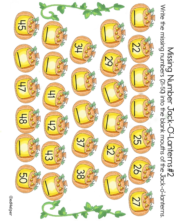 Help! Some Jack-o-lanterns have missing numbers. Count and fill in the blanks.