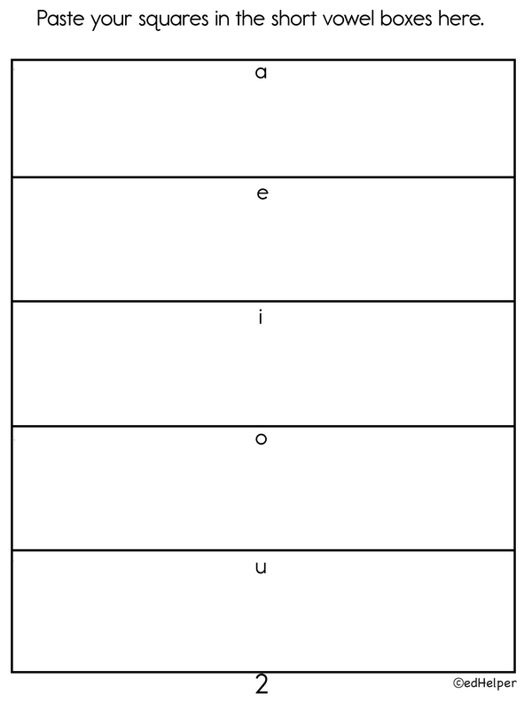 Cut out the picture-word cards (net, log, sun, tub, pan, etc.). Say each word and listen for the short vowel sound. Glue each card under the matching vowel label (a, e, i, o, u) on the next page.