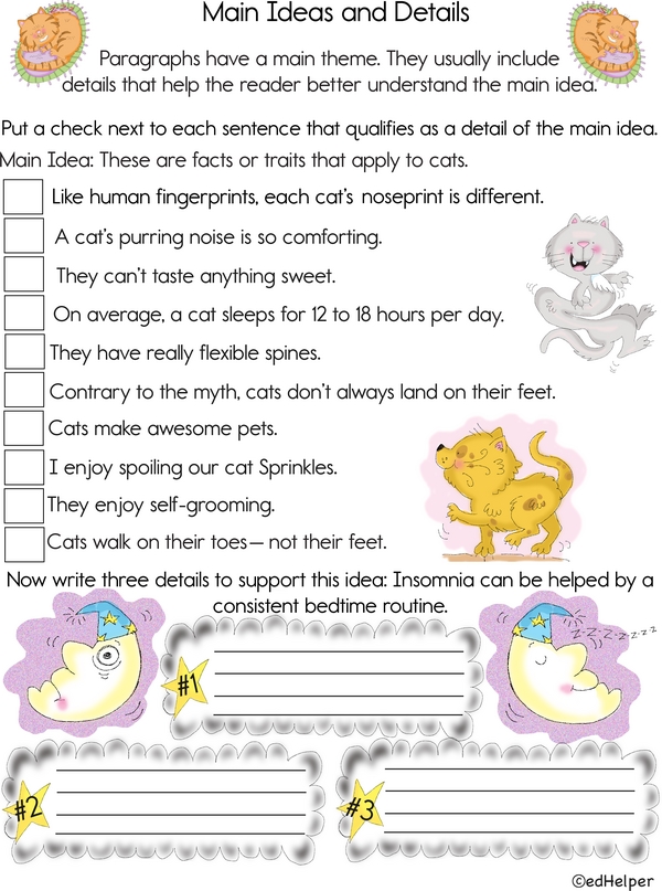 Want to talk and write better? Start with a main idea and support it with details. Want to give it a try? First, find the details that tell facts or traits about cats. Next, write three details about helping insomnia with a consistent bedtime routine. Enjoy the challenge!