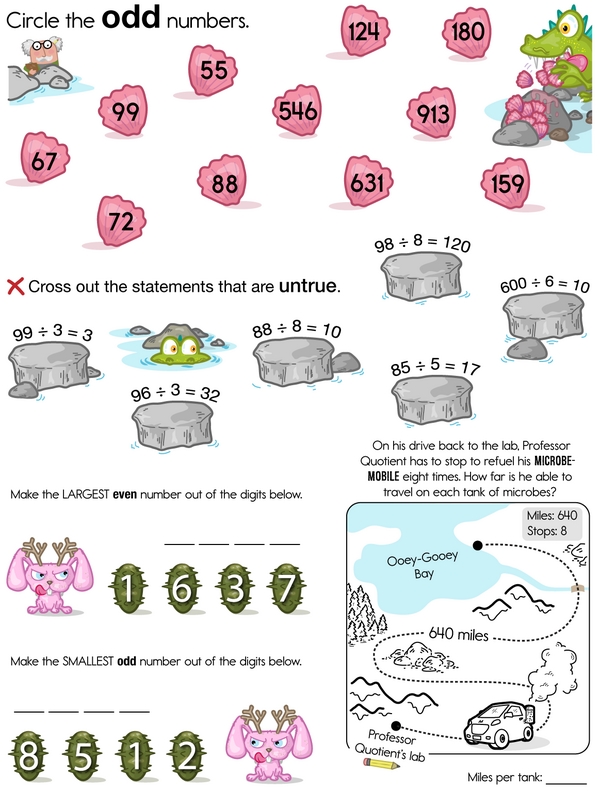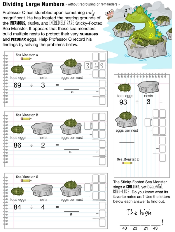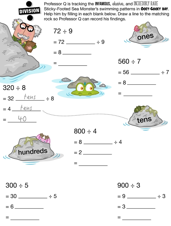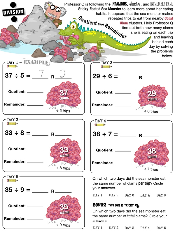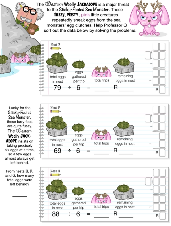 Hurry, Professor Q needs you to join him on a research field trip right away! You'll use different methods of division to record his findings and figure out quotients and remainders to solve the problems. All of this will help Professor Q unlock the secrets of the Sticky-Footed Sea Monster. Thanks a bunch!