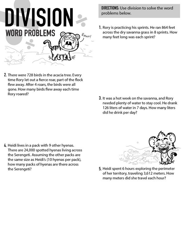 Let's tackle some division word problems! Rory the tiger and Heidi the hyena love exploring the savannah. They keep track of their activities, but they don't know how to make sense of the records. Can you use your division skill to show them how?