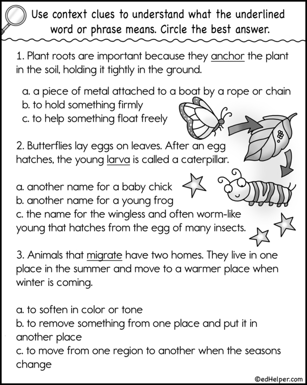 The activity involves students reading each sentence carefully and attempting to deduce the meaning of the underlined word. They'll utilize context clues within the text, such as nearby words and the general tone of the sentence, to gather hints about the word's definition. Additionally, students will be provided with multiple-choice options to help them choose the correct meaning.