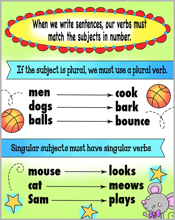 These two educational posters teach the importance of subject-verb agreement in sentence construction. They emphasize that verbs must match their subjects in number, ensuring grammatical accuracy. For instance, in sentences with plural subjects, such as "dogs," a corresponding plural verb like "bark" should be used. Conversely, when dealing with singular subjects, a singular verb is necessary. An example is the sentence "The mouse looks at the door," demonstrating the correct usage of a singular verb with a singular subject.