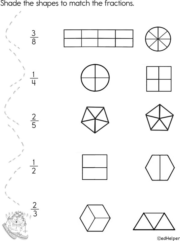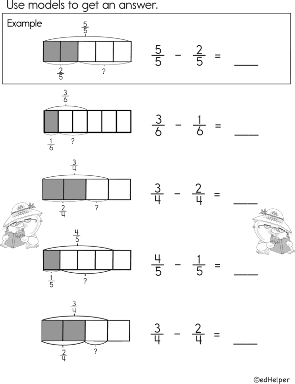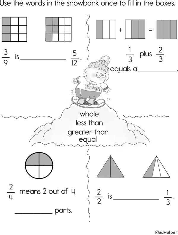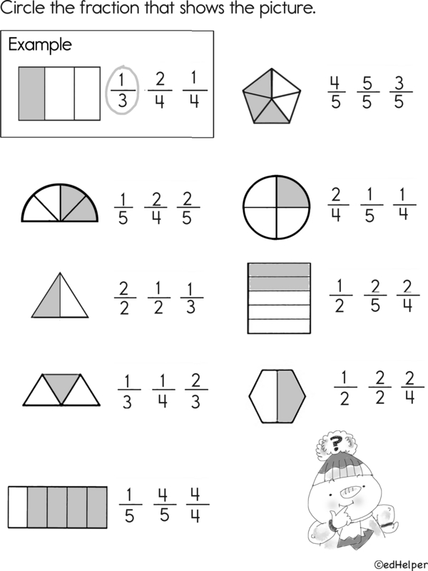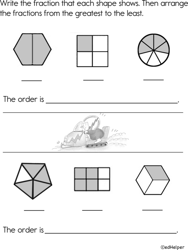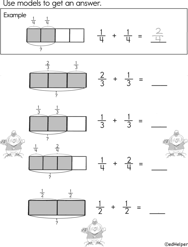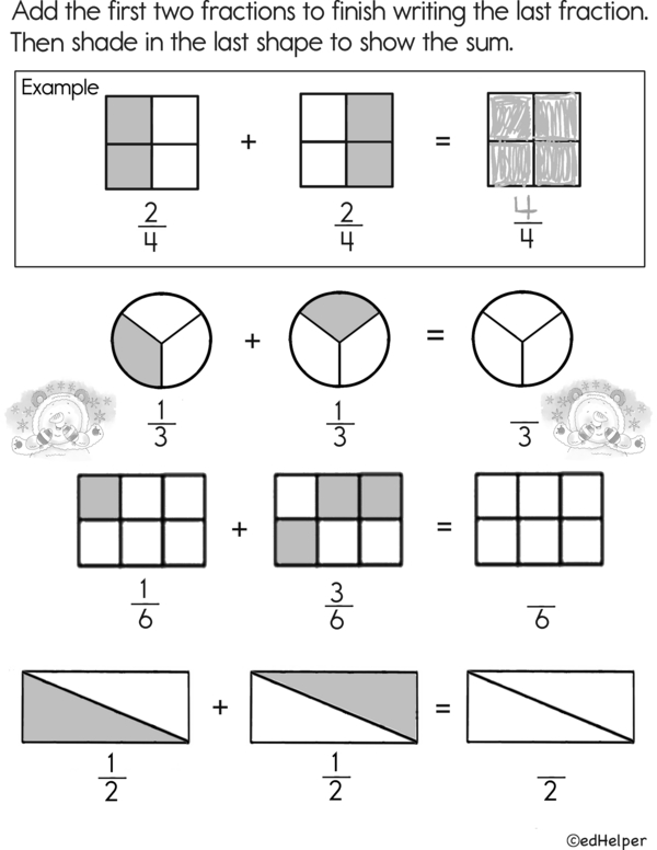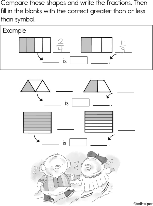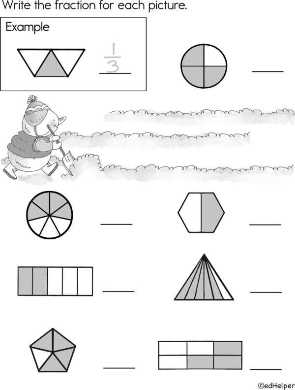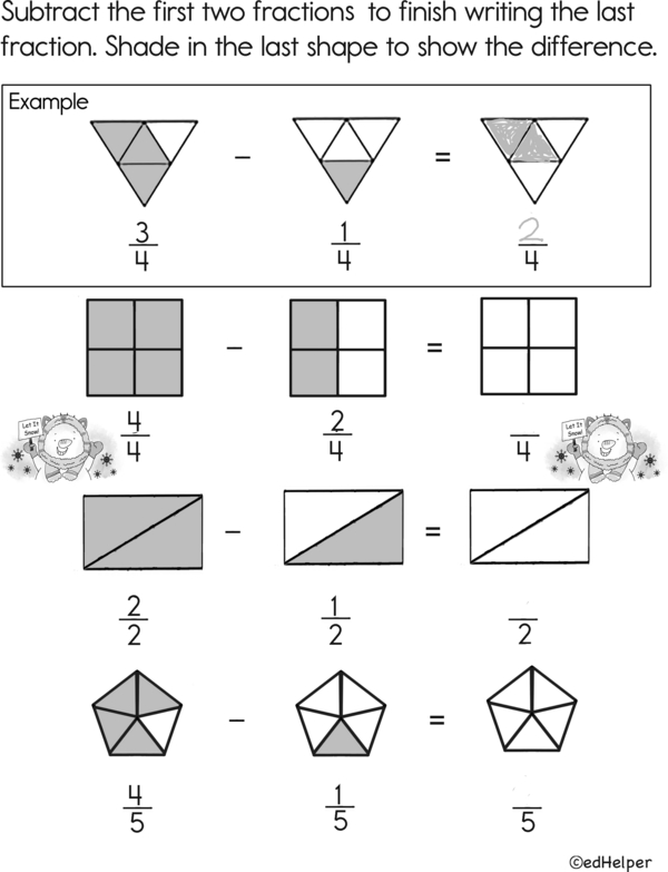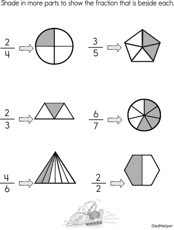 Ready for some fractions fun? Can you tell if a shape is divided into equal parts? Can you write a fraction that matches each picture? What about comparing, adding, or subtracting fractions? Follow the directions, study the examples, and finish them all!