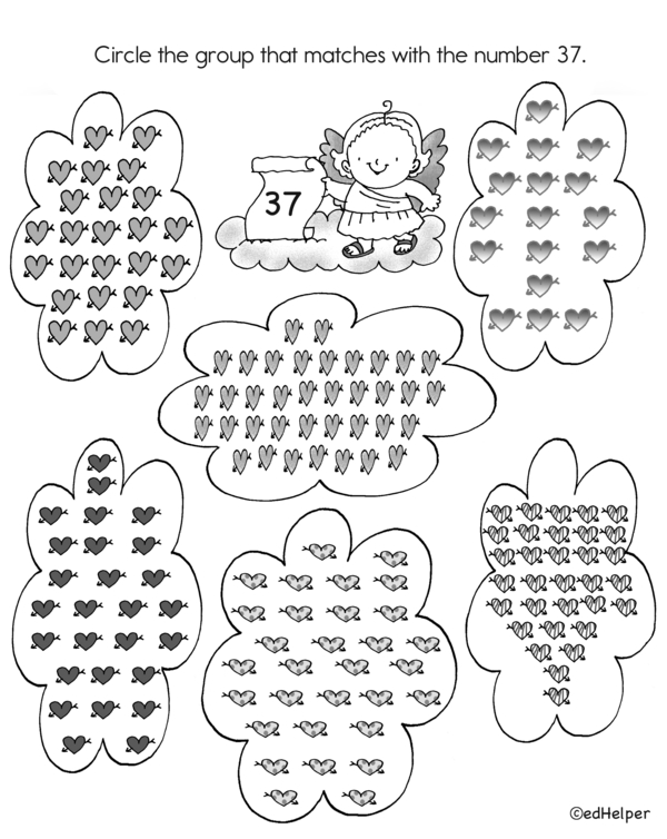 Let's have fun learning letters and counting! On page 1, dive into the world of "B" and "E." Count the eels, complete the word patterns, and name the animals. Don't forget to help the eagle find its way home. On page 2, join Cupid to find the group with 37 Valentine hearts.