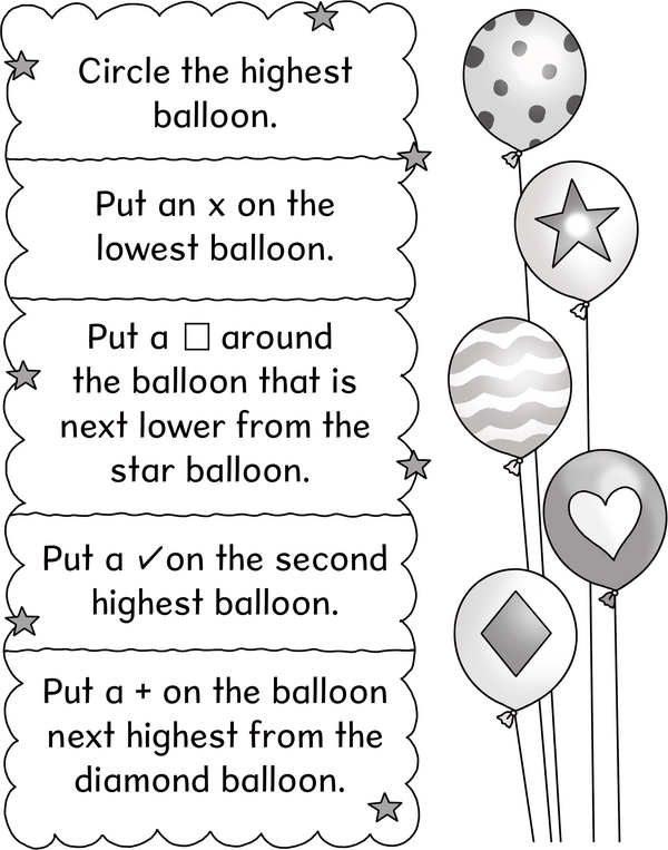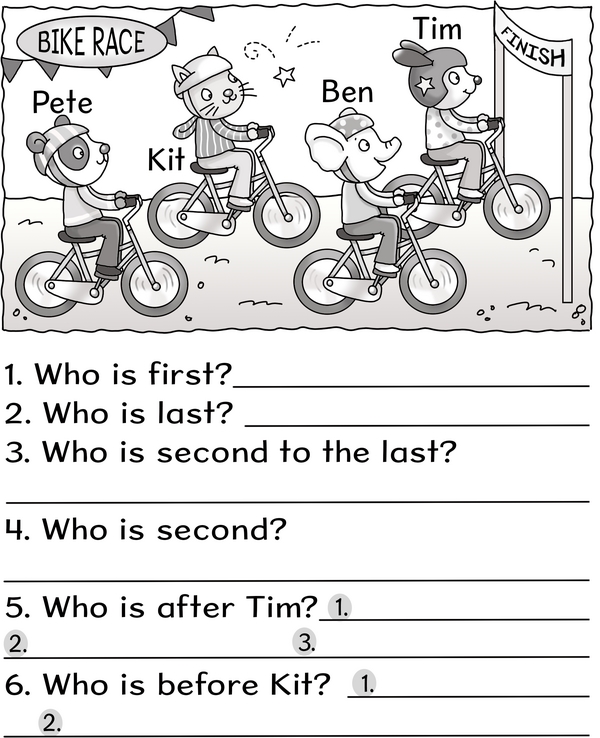Check out this fun workbook! It's all about putting things in order. On page 1, look at each set of four pictures. Can you label them in the correct order? Next, head to the finish line of a bike race. Study the picture and answer questions like who comes first, next, and last. Finally, see the five balloons of different heights? Crack the clues and follow the directions to label the balloons.