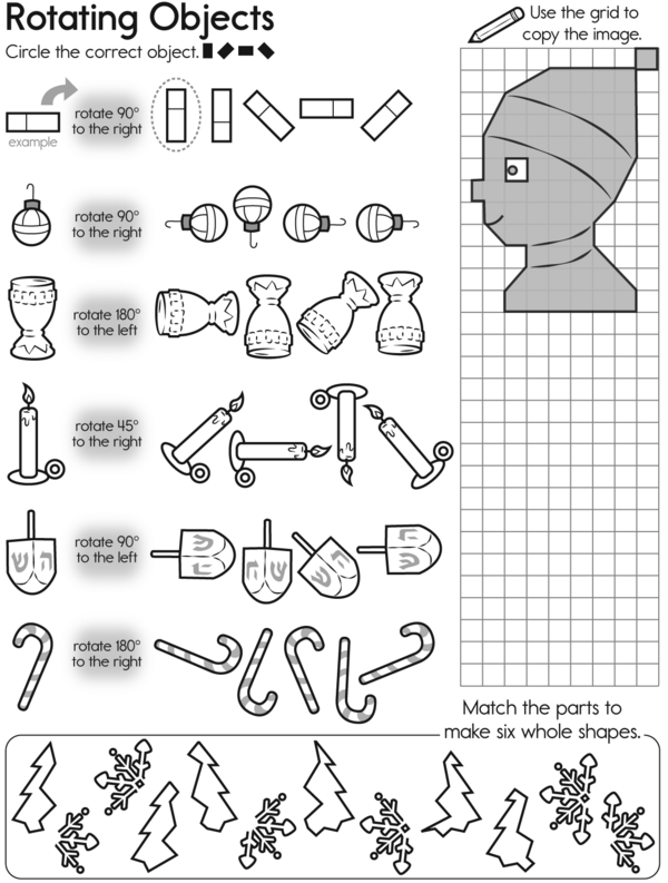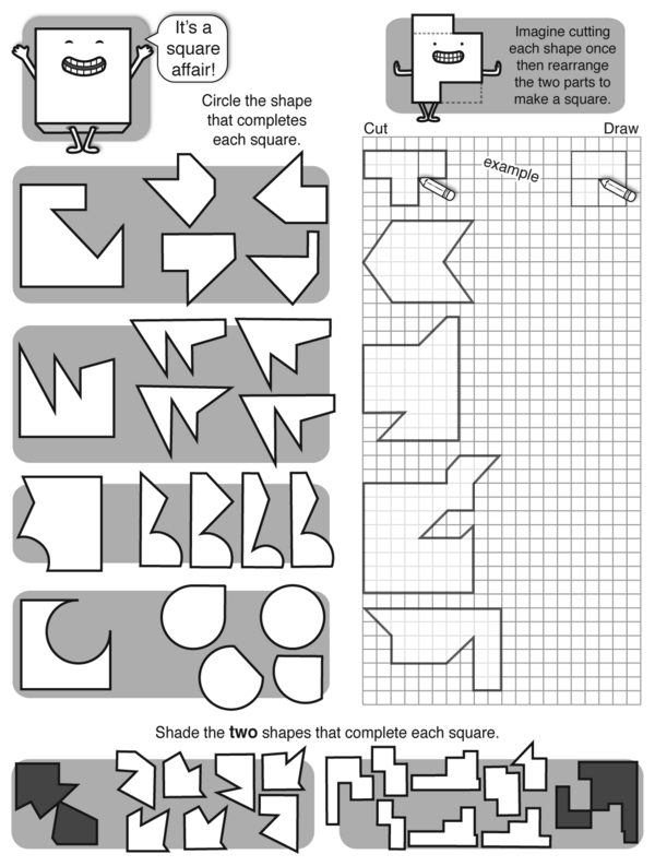 Ready to fly kites and play with shapes? This workbook has all that and more! First, read the directions carefully and help the two kids map out six ways to reach the ridge so they can fly their kites. Next, it's all about squares! Each activity on this page challenges you to create one. Find the missing shapes or rearrange the parts to make perfect squares. Finally, follow the rotation instructions to circle the correct objects, draw a replica, and piece together six whole shapes to wrap up the fun!