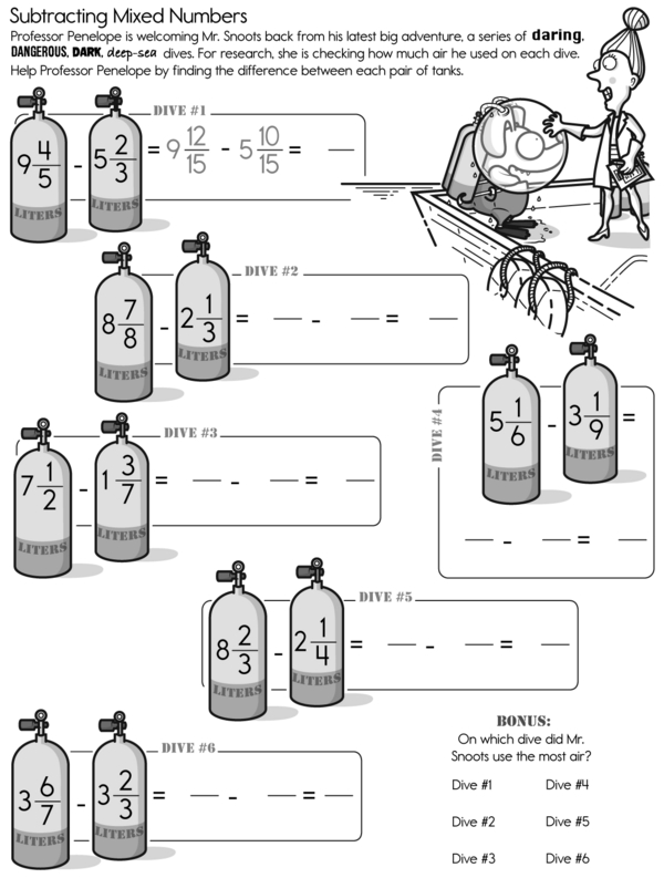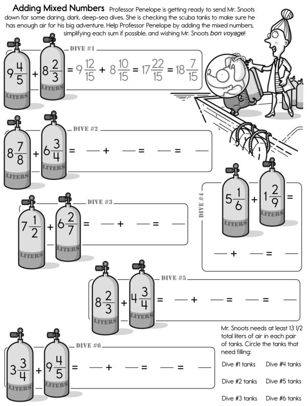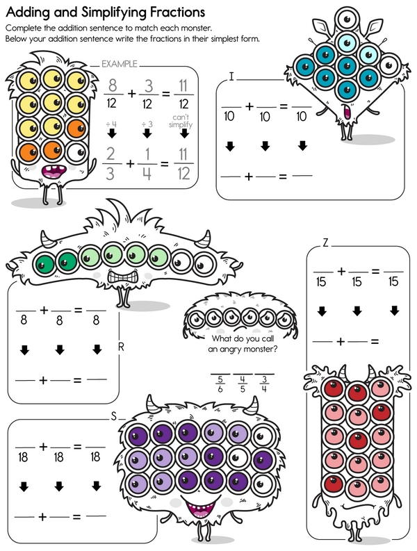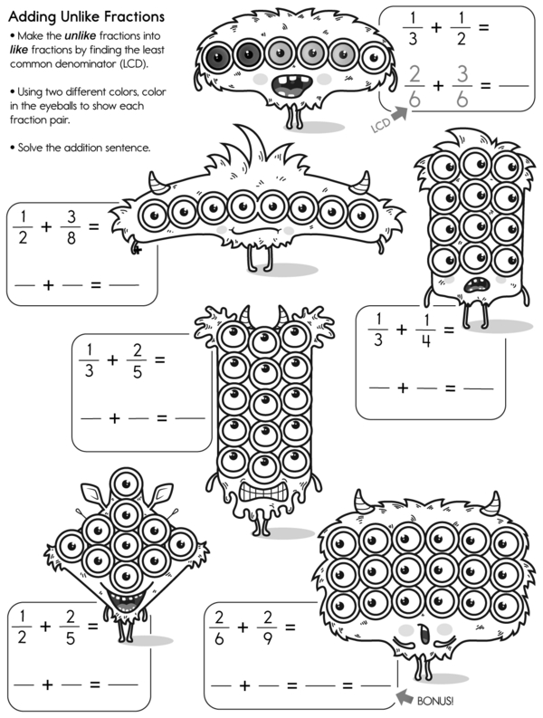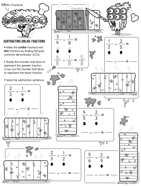 Add and subtract fractions with unlike denominators, including mixed numbers, by replacing given fractions with equivalent fractions. Fifth graders should know how to simplify fractions into their simplest form and will get practice with that in this colorful series that focuses on fractions and mixed numbers. Kids should understand that two fractions are equivalent if they are the same size or the same point on a number line. In this practice workbook, students will add and subtract fractions and mixed numbers using the same and different denominators.