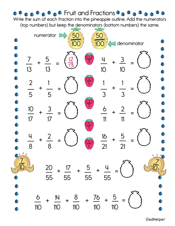 A fraction is a part of a whole. The number on top is the numerator, and the number on the bottom is the denominator. When you add two fractions, check the denominators first. If they are the same, just add the numerators. For example, 7/13 + 5/13 = 12/13. Now, grab your pencil and finish the activity!