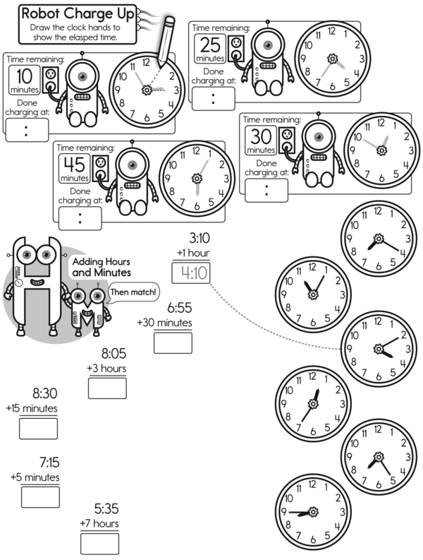 Ready to clock in for some math fun? First, find the total and figure out which number is bigger. Add, compare, and solve! Next, these robots are running low on battery. Some need less time to charge, while others need more. What time is it on each clock? When will each robot be fully charged? Add the time remaining to find out! Write your answers, then follow the directions to draw the clock hands or match them to the right clocks.
