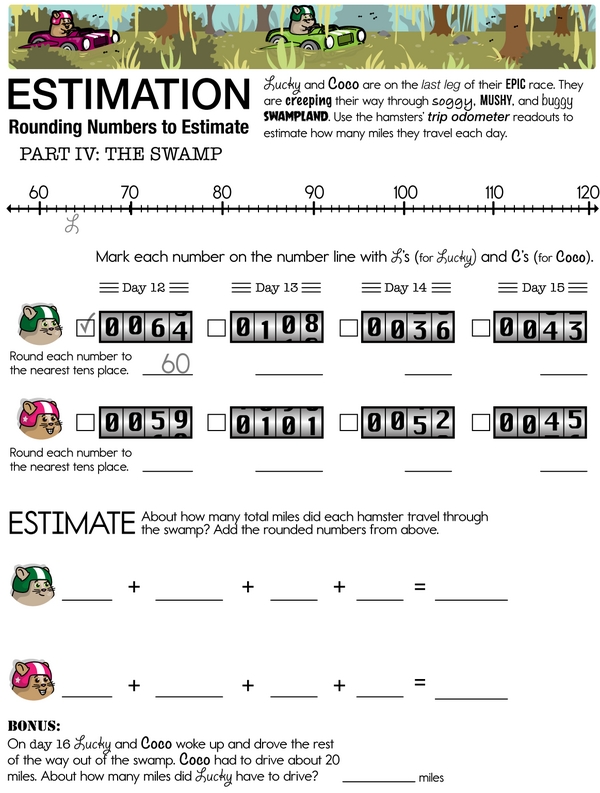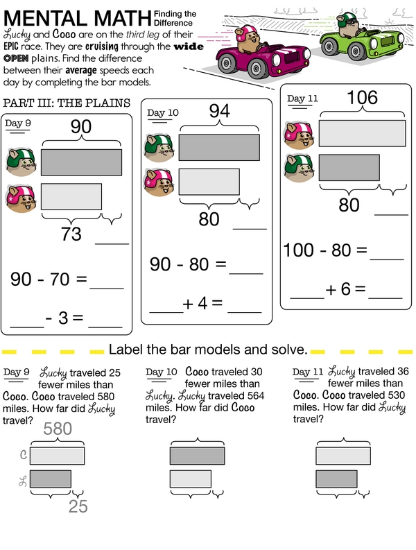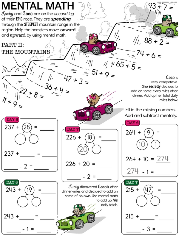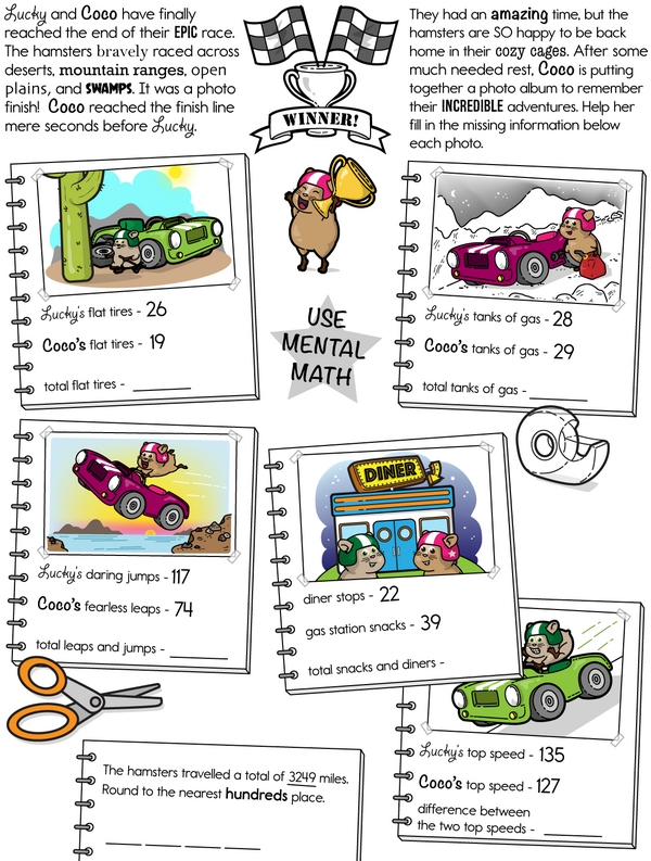 Hurry! An epic race is about to start! Help Lucky and Coco track their results using mental math. Along the way, you'll also use number bonds, bar models, and rounding in all sorts of addition and subtraction puzzles. Sounds fun, right? Grab your pencil, and let's go!