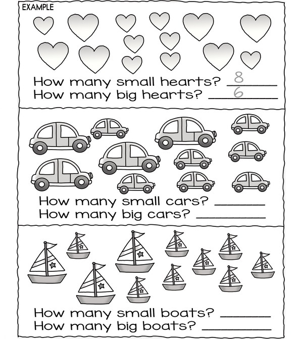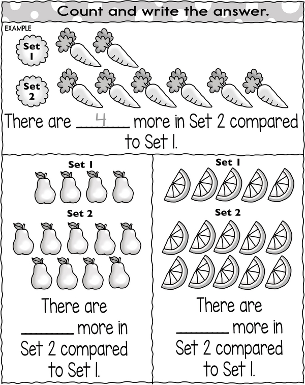 Let's count and compare! Which group has more? How many more? Count the items and write what you find!