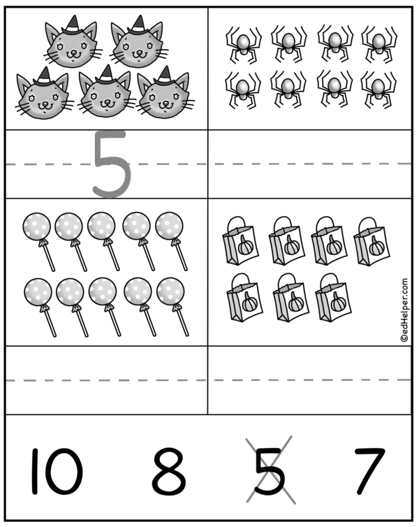 Let's get ready for Halloween! How many items are in each group? Count, add, and write your answers.