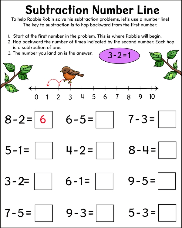 Robbie Robin loves subtraction, and he loves hopping, too! Show him how to hop back along the number line to solve subtraction problems.
