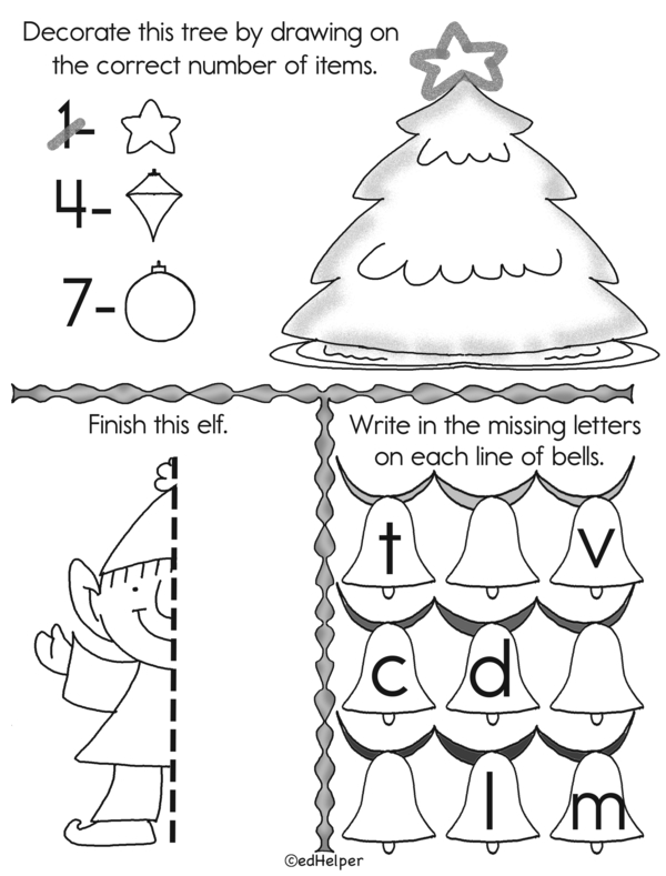 Get ready for some fun with 123s and ABCs! First, roll two dice, draw what you get, and write the total. Then, on page 2, follow the directions to decorate a tree, complete the elf, and fill in the missing letters.