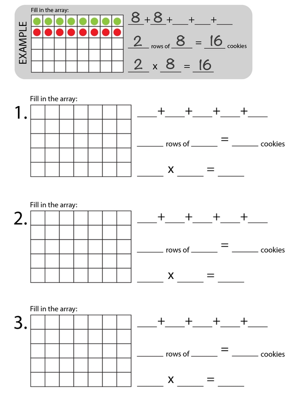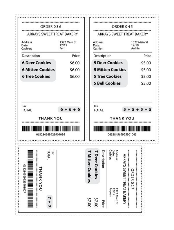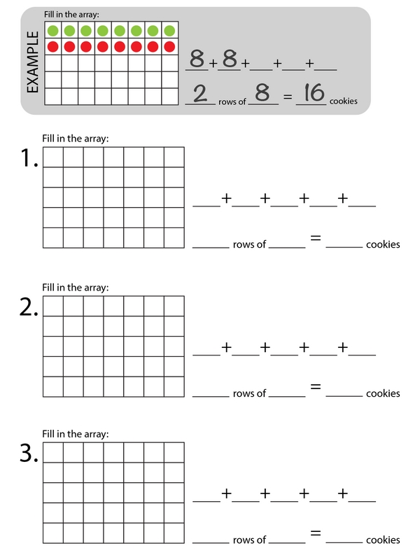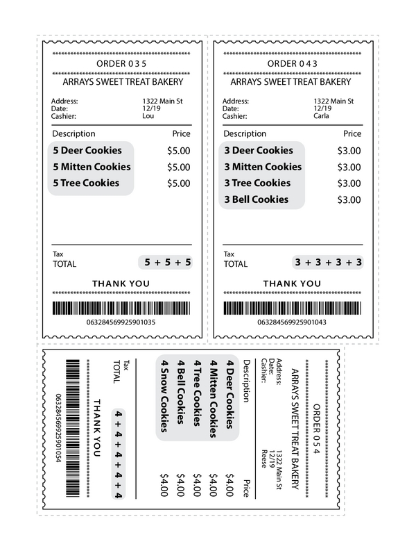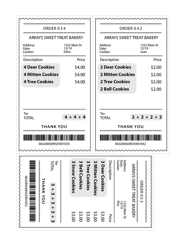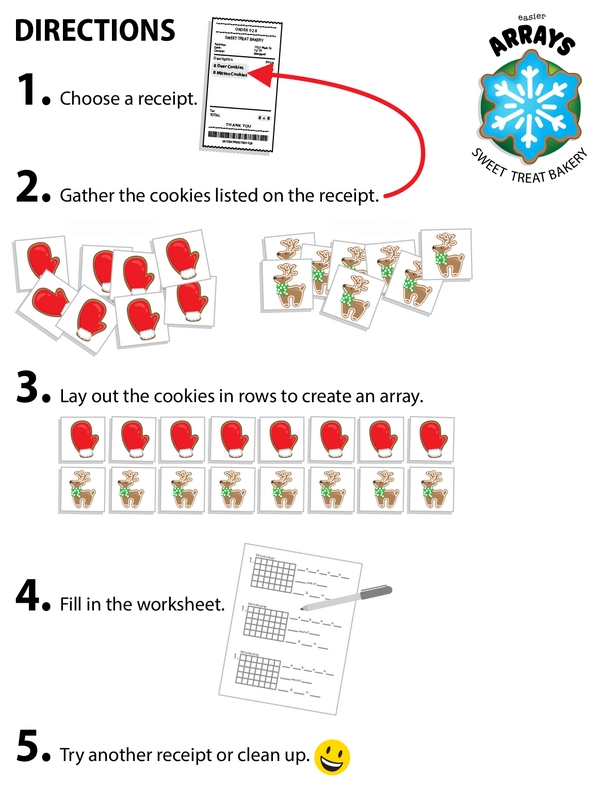 Thanks for coming by to help pack the sweets! Choose any receipt and gather the cookies listed on it. Lay out the cookies in rows to make an array, then use crayons to draw the array on your worksheet. How many cookies are in that order? Solve it using repeated addition or multiplication.