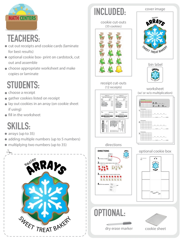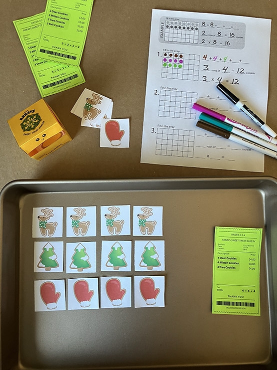 This learning center shows kids how arrays work. As they assemble the cookies for each receipt, they create a colorful array. Then they use repeated addition or multiplication to find the total.