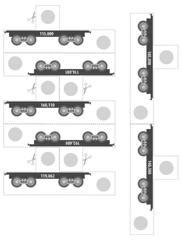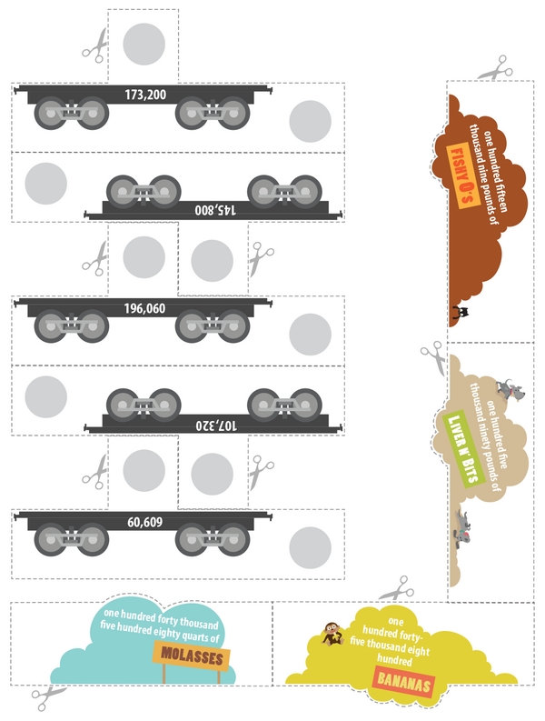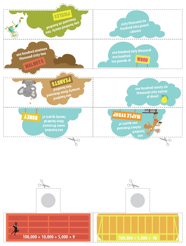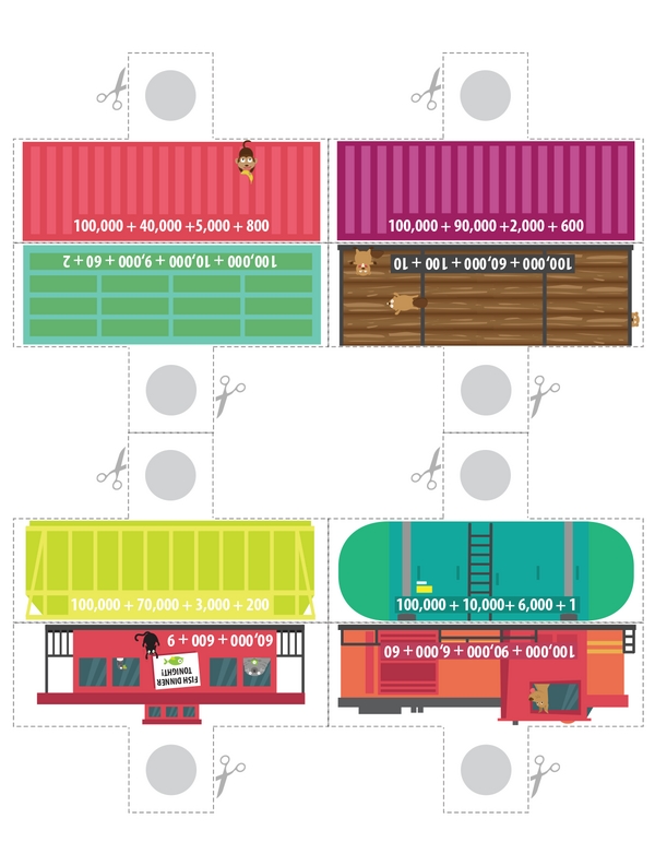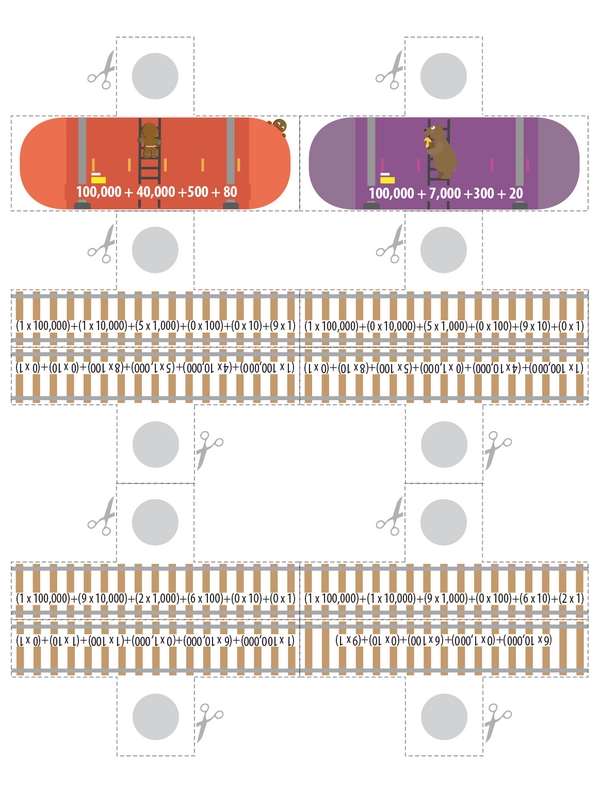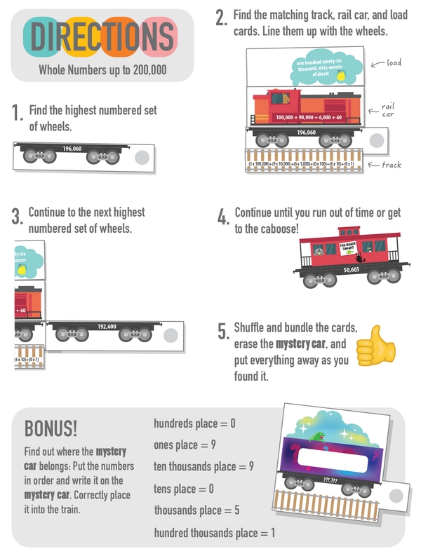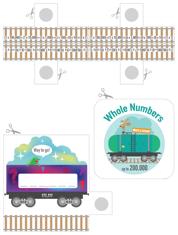Can you help assemble the Whole Number Express? First, line up the sets of wheels from the largest whole number to the smallest. Next, figure out each whole number's word form and two expanded forms so you can put everything together. Wait, what about the mystery rail car? Crack the place value clues, then slide it into its correct spot on the Whole Number Express.