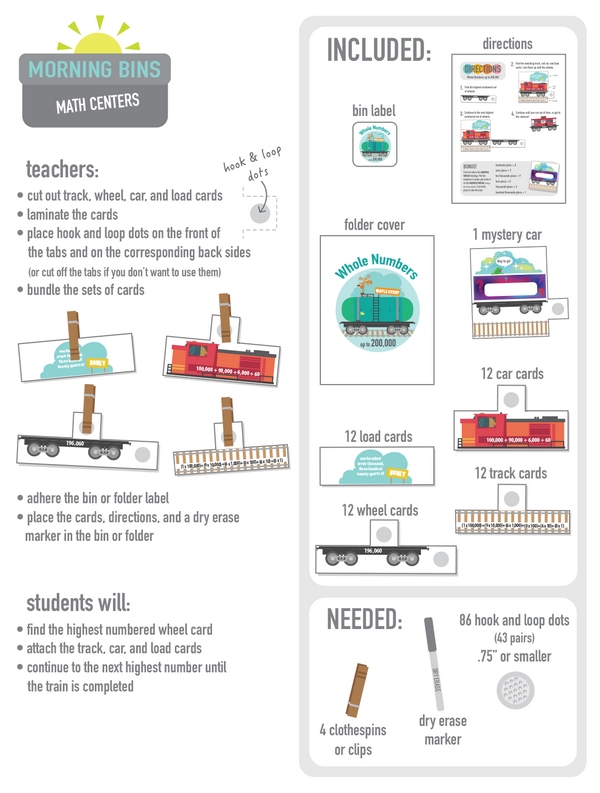 This learning center helps kids become familiar with expressing whole numbers in standard form, word form, and two types of expanded form. It also gives them a hands-on way to practice place value for numbers up to 200,000.