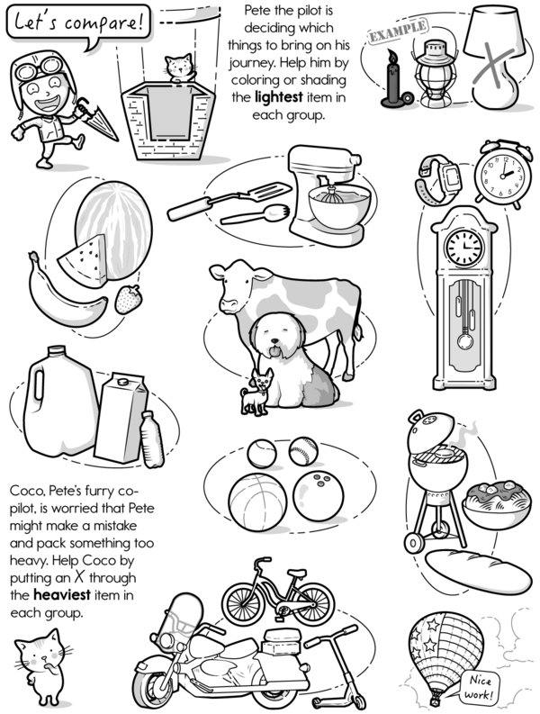 Carly, Pete, and their furry friends need your help! On page 1, look at each group of items and compare their lengths. Color or shade the longest and put an X on the shortest. Remember to draw Carly's long canoe! On page 2, Pete and his furry co-pilot, Coco, are ready for take-off in their hot air balloon. Compare the weights of each group of items. Color or shade the lightest and put an X on the heaviest. Bon Voyage!