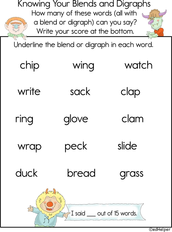A blend is a group of 2 or 3 letters where you can clearly hear each letter sound if you say the word slowly. A digraph is a group of 2 letters that make a single sound. Now that you know the difference, say each word aloud, underline the blend or digraph, and count how many you find.
