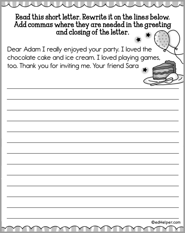 In this workbook, kids will practice writing their letters. They will also rewrite a provided letter and learn the proper format, including salutations, body paragraphs, and closings. Correct punctuation is essential; they must use commas, periods, and other punctuation marks accurately to ensure their letters are clear and professional. Through these exercises, children will gain confidence in their writing skills and understand the importance of structure and clarity in written communication.