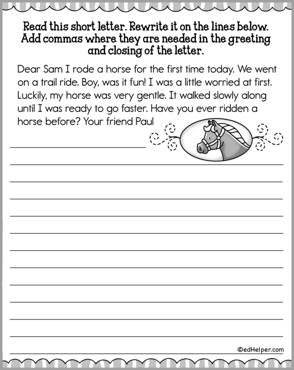 In English Common Core L.2.2.b, students learn a practical skill using commas in greetings and closings of letters. This includes understanding where exactly to place commas within the salutation and closing of a formal or informal letter. This skill extends to understanding when to use a different punctuation mark, such as a colon, instead of a comma. The main objective of this standard is to ensure that students are proficient with using correct punctuation when engaging in written correspondence.