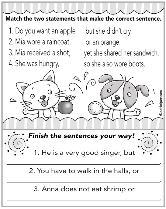 Coordinating conjunctions are like mini bridges. They help link words and sentences together. There are seven common ones with a catchy name, FANBOYS (For, And, Nor, But, Or, Yet, So). In this workbook, you'll see them in action. Grab your pencil and take on the challenge!