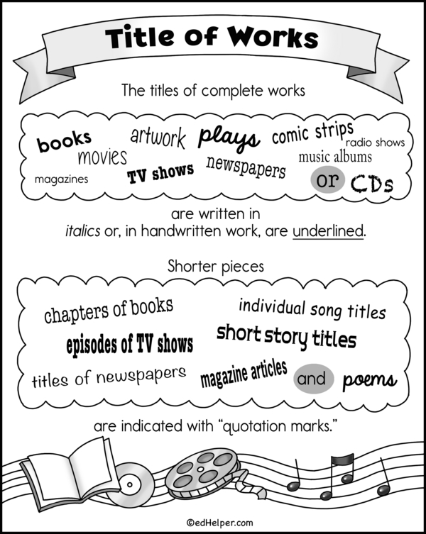 This poster offers guidelines on correctly formatting various complete works and shorter pieces. The first part details the treatment of complete works, enumerating examples such as books, movies, plays, newspapers, and magazines. It underscores that these titles should be italicized or underlined to ensure proper presentation. The poster's second section addresses the formatting of shorter pieces, such as TV show episodes, short stories, and song titles. Here, it instructs that these types of works should be enclosed in quotation marks.