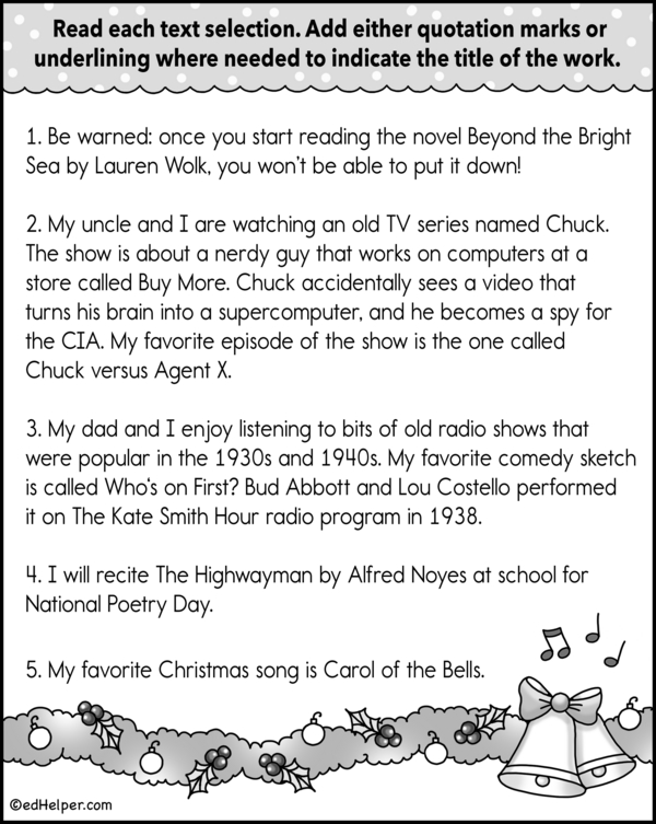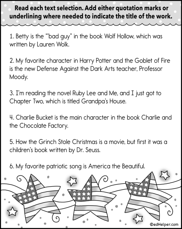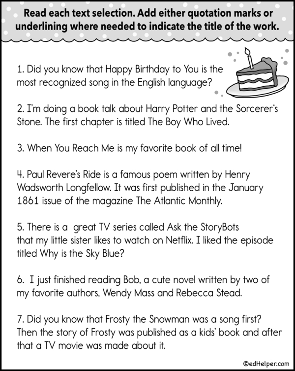 In this workbook, students develop their skills by practicing correctly using title formatting. They learn when to appropriately add quotation marks or underline titles, ensuring they follow the conventions for different types of works, such as articles, books, and movies.