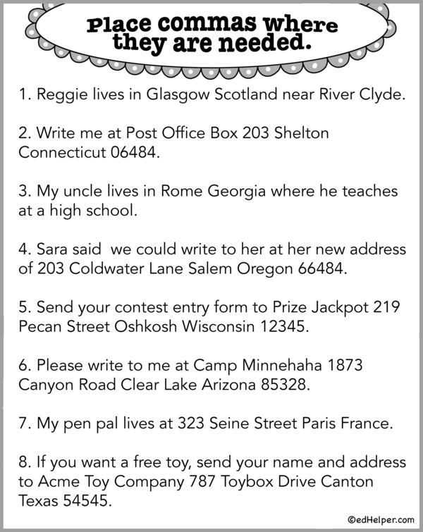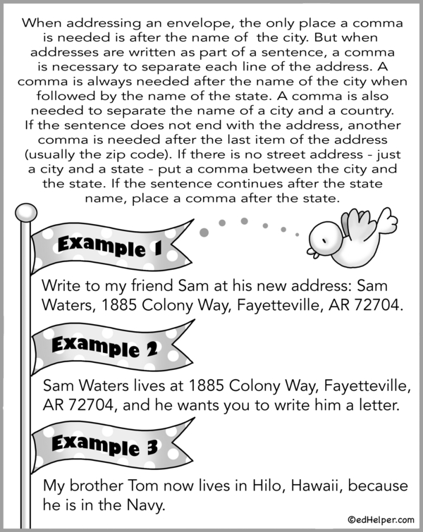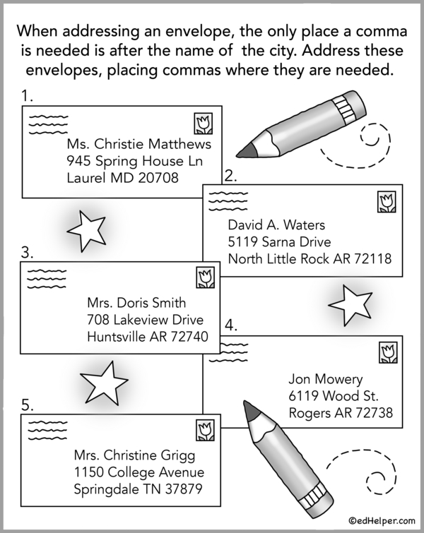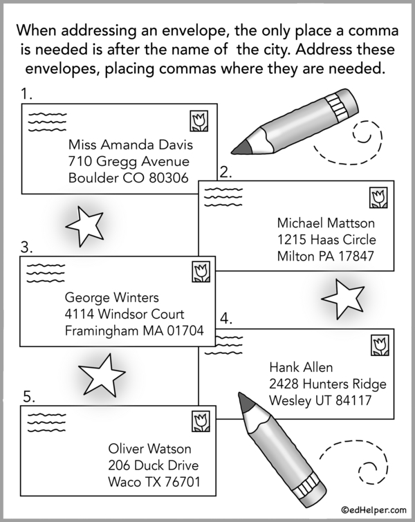 This worksheet is designed to help students improve their comma usage following the English Common Core Standard L.3.2.b. It focuses on using commas correctly when addressing an envelope. By working through the worksheet, students learn how to separate parts of an address, such as the city and state.